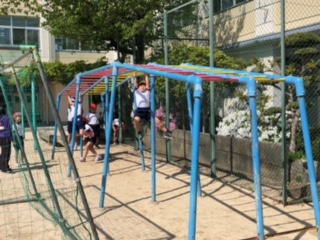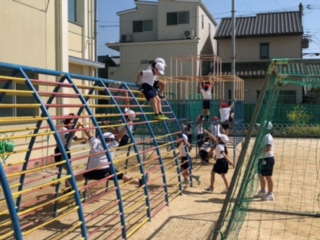 「手が痛い!」「もう無理!」「高いところ怖い!」の弱気な声が聞こえる一方で、黙々と、歯を食いしばって、必死になってチャレンジする子どもの姿もありました。それでも笑顔がたくさんあって、体を動かすことが大好きな子どもたちでした!最後には鬼ごっこ!一目散に広がって楽しそうに走る姿が印象的でした!
