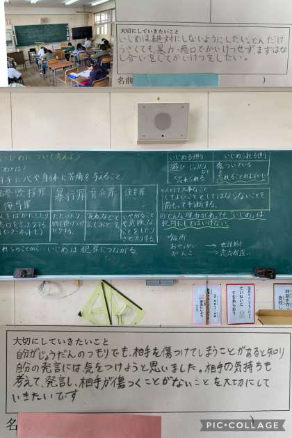 いじめが犯罪につながること、人の心を傷つけてしまうことなど、ことの重大さについて話し合いました。いじめる側といじめられる側の認識の違いを見つめ直し、人ととして大事なことである、してよいこととしてはならないことを前もって判断することを学びました。