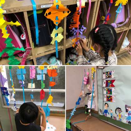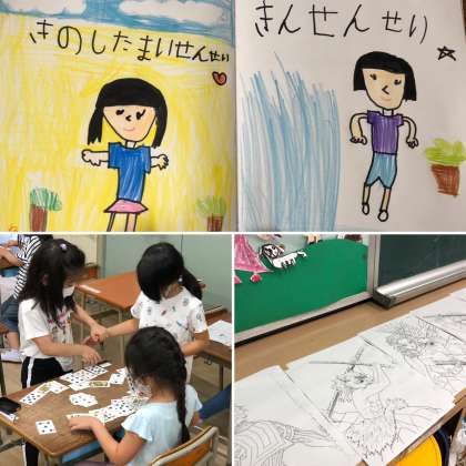 1年生の教室をのぞくと、色紙を使って思い思いの形を切り、飾りを楽しむ子どもたちやトランプに興じる子どもたちなど、様々な楽しみ方をしていました。なかでも絵を描く子どものすてきな一枚を発見しました!二人の先生の絵です!絵のバランスも色使いもとてもすてきな一枚でした。