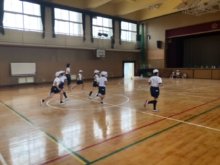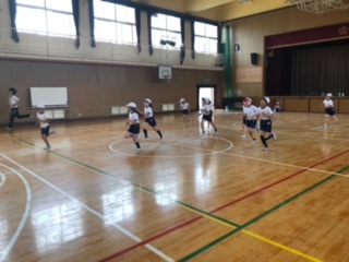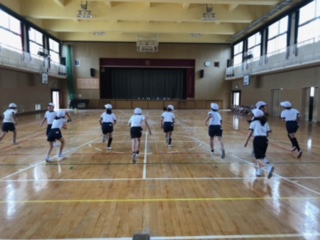 講堂から走る音と電子音が聞こえてきました!のぞいてみると、子どもたちが「20mシャトルラン」にチャレンジしています!走るタイミングが時間とともに短くなります!持久力が試される体力づくりです!