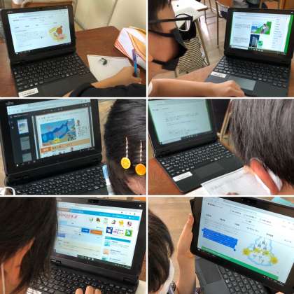 これまでなら、パソコン教室に移動して行っていたネットを使った調べ学習でしたが、今は、「一人一台学習用端末(パソコン)」が手元にありますので、すぐに学びに取り掛かれます。まさに、「文房具のひとつ」としての役割になっています。