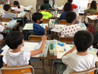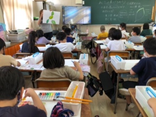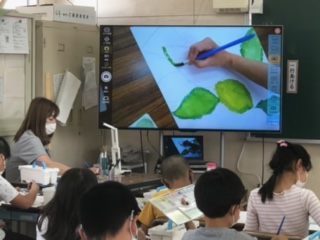 大型スクリーン上では先生もチャレンジする様子が映し出されています!それらを見本にしながら、子どもたちはパレットの上で自分らしく自分から色をつくり、画用紙の上に表現しています!