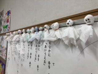 背面黒板の上には、「晴れますように!」の願いを込めたてるてる坊主がならんでいました!外は少し下り坂に入っています!晴れるといいのにね!