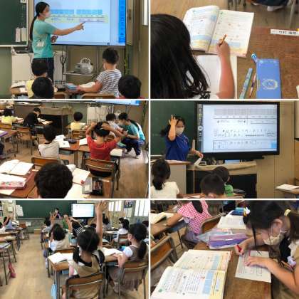 大型スクリーン上にはデジタル教科書による教材が提示され、100のまとまりをわかりやすく指導することができました。オリジナルの問題を提示することで、子どもにとって、よりわかりやすく、取り組みやすい学習環境が創造されていました。