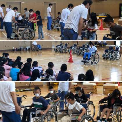 はじめに、車いすの各名称からその働きをていねいに教えてもらいました。どうしたら上手に乗ることができるのか、そして、反対に、どうしたら危険なことになるのかを実演んを交えながら、迫真の演技で伝えていただきました。子どもたちにとってもとてもわかりやすい説明で、とても学びが深まったと思います。