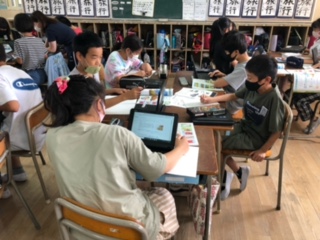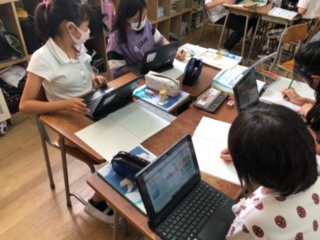 子どもたちは家のカレーの具を書き出しました!牛肉、じゃがいも、玉ねぎ、ピーマン、なす!などなど、そして、サラダの具材についても書き出しました!さらに、それらを動物なのか植物なのかを区別していきます!さらにさらに、その動物たちが餌として何を食べているのかをパソコンで調べます!