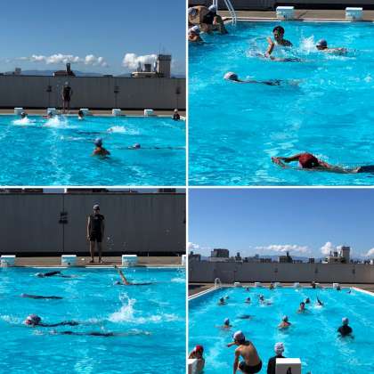 子どもたちは快晴の空の下、のびのびと泳ぎを楽しんでいました。