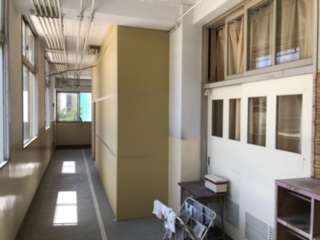 トイレ前には廊下にせり出した工事用の壁が設置されています。