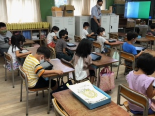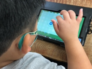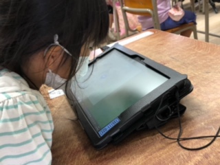 タブレットのボイスメッセージ機能を使って、自分の声を録音します。子どもたちは説明をしっかりと聴いて、すぐにやり方をマスターしました!自分の声がタブレットから聞こえてくることに不思議さと面白さが合わさり、子どもたちの笑顔が広がっていました!