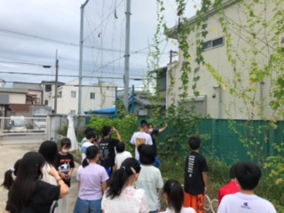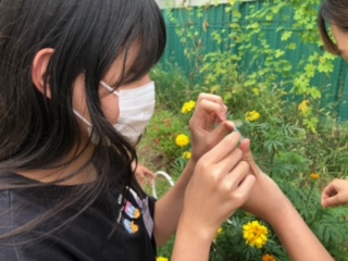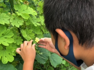 今日は外に出て、学習園に向かいました!顕微鏡の学習のための素材として、学習園に咲く、花たちの力を借ります!ゴーヤの花やマリーゴールドの花などの花粉をとる子どもたち!