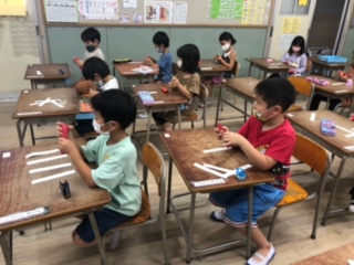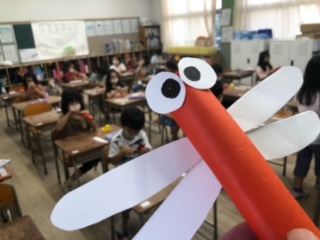 「オレンジは先生の好きな色!」と話しかけてきてくれる子どももいました!上手にテープを切って、丁寧に作品を仕上げています。できあがりはなんと!「トンボさん」です!