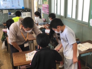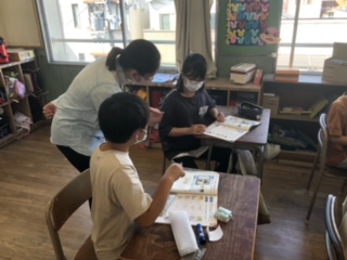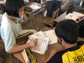 子どもたちは近くの仲間と聞き合いをします!テーブル拭きや庭掃除など、英語を使って表現にチャレンジしています!みんなの笑顔が広がっていました!