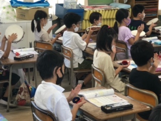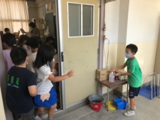 タンバリンを使った後には、しっかりと手指消毒をします!感染症対応にも注意している子どもたちです!