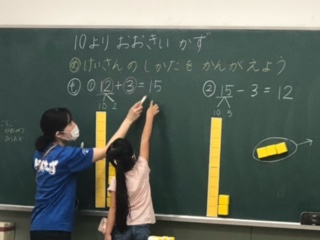 子どもたちの手がどんどん挙がります!10よりおおきいかずについての学びです!黒板の前に出てきて、自分の言葉で自分の考えをみんなに伝えます!