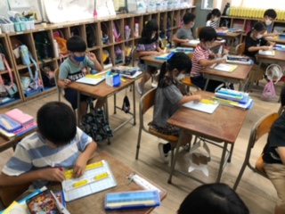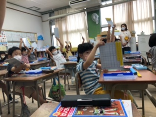 子どもたちは算数のブロックを手にして、10より大きい数を並べます!10とあといくつかな?と10のまとまりを意識しながら、残りの数を求めます!自分が並べた答えのボードを先生に見えるようにして答えあわせ!子どもたちは元気よく答えのブロックを高々とあげて答えていました!今が基本の学びです!繰り返しながら定着させていきます!