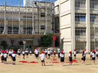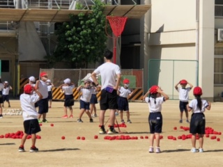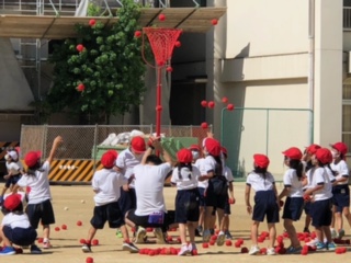 赤白に分かれて、子どもたちは一生懸命に籠めがけて球を投げ入れます!リズムに合わせて、リズムを楽しんで、ゲームを楽しむ姿がすてきでした!