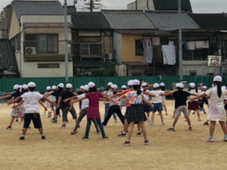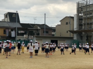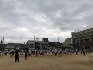 合同で準備運動の学びです!自分の立ち位置の確認や動きのチェックをしっかりと行います!今日は曇り空のため、過ごしやすいお天気になっています!