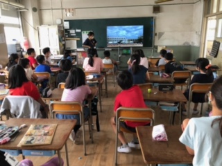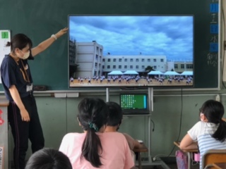教室から運動会の音楽が聞こえます。のぞいてみると、子どもたちが大型スクリーンに釘づけ!