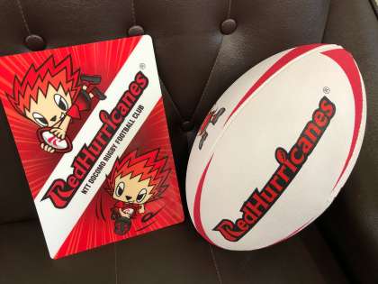 ひとつは全員に下敷きを、もう一つは学校にラグビーボールです!