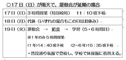※なお、延期の場合の判断は17日(日)7:30に行い、学校ホームページ及び、保護者メールでお知らせします。