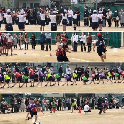 リレーはさずが高学年の走り!その迫力に圧倒されました。バトンが落ちても、つまずいて倒れても、あきらめずに走り続ける姿に心打たれました。心を一つにしたソーラン。テント下での気持ちの高ぶりそのままに、運動場の舞台に立ち、見事に最後まで表現することができました。腰の低さ、腕の伸び、キリっとした顔つき、どれも見るものの心に響きました。「やればできる」この力をこれからも活かして、東小路小学校のみんなをリードしてください。