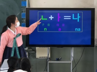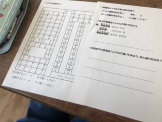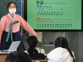 文字の成り立ちを詳しく知る子どもたち!母音と子音の組み合わせで文字が作られていることや発音も同じ「オ」でも出し方が違うことなどを学びました。そして、自分の名前をハングルで書いてみました。子どもたちは難しいと言いながらも、興味を持って楽しみました!