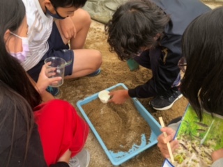 実際にトレーの中の山の斜面に川をつくり、上流からの流れを想定して実験しました!