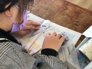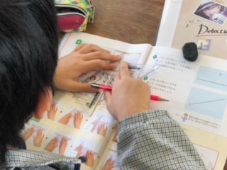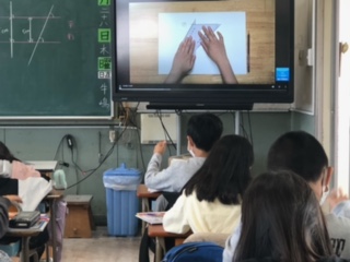 大型モニターにはその実演が映し出されています。動画による説明の効果は高いです!子どもたちは手元の操作に気をつけながら作図にがんばっていました!