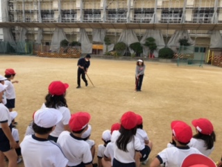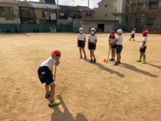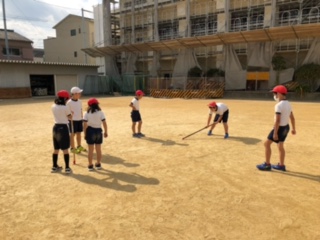 今日は机の上で学んだことを、運動場に飛び出して、より大きな円を描きながら、コンパスのイメージをふくらませます。中心を動かさない!ひもをピンと張って、中心からの距離(半径)を一定にするなど、体を動かしながら、操作活動を繰り返しました。
