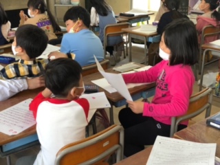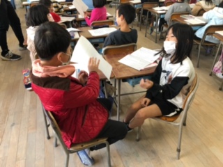 子どもたちはお隣の人とペアになって、伝え合います。相手の良かったところや聞きたいところを自分の言葉で伝えます。