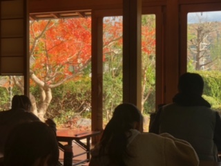 ランチタイムです!お庭に面した旧家のお座敷が食事場所でした。紅葉が眩しいくらい色づいていました。