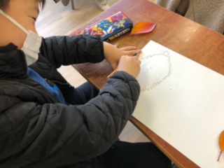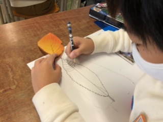 一枚の紅葉した葉っぱをよーく観察しながら、画用紙に写していきます。葉っぱの周辺のギザギザや葉脈の細かい線などを丁寧に写しとる子どもたちでした!