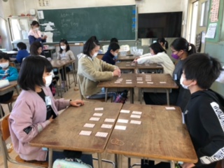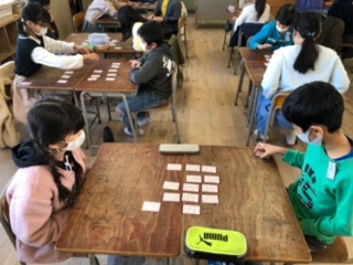 本校で継続して取り組んでいる「五色百人一首」です!一色20枚の札を相手と取り合います。個人差はあるものの、みんな真剣な眼差しで、百人一首を楽しんでいました!