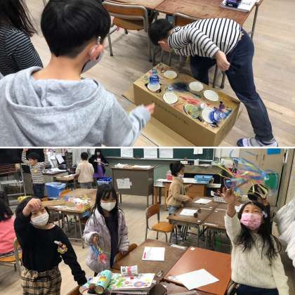 子どもたちがグループで協力してつくった遊び道具をみんなで楽しみました。