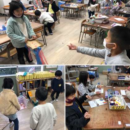 すべてのグループの遊びを体験できるようにローテーションを組んで、それぞれの遊びを楽しみました。終わってからは、いいとこ見つけをしました。友だちのがんばっていることや良さを見つけて言葉にすることは、お互いの励みとなります。なかよく、楽しく遊ぶ姿がとてもかわいかったです。