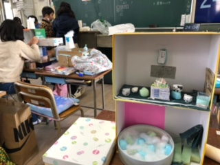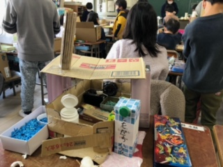 「ともだちハウス」が着々と築かれています!お家から持ち寄ったいろんな種類の箱たちが大変身しています!