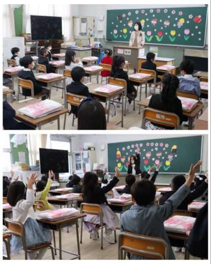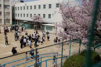 各教室で教科書を受け取ったあとは、運動場の桜の木の下で家族と記念写真を撮っていました。