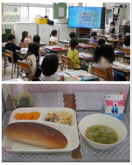 今日の給食の献立は、「黒糖パン、牛乳、マカロニグラタン、レタスのスープ、みかん(缶)」でした。