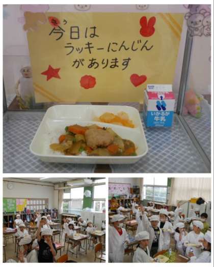 今日の給食の献立は、「ごはん、牛乳、カツカレーライス、フルーツゼリー」で、ラッキー人参が入ってました。