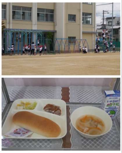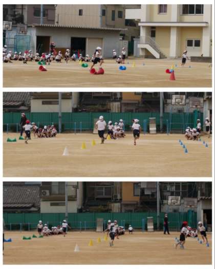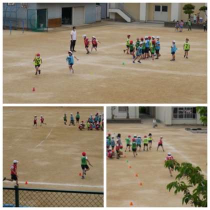 4年生はリレー、2年生はコーンを避けてジグザグに走ったり、跳び越えたりしました。1年生はジャングルジムや上り棒などの固定遊具で遊びました。