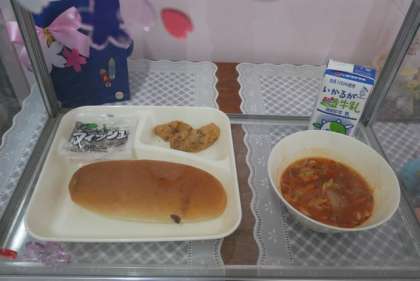 今日の給食の献立は、「レーズンパン、牛乳、ひと口トンカツ、ミネストローネ、ミニフィッシュ」でした。