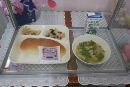 今日の給食の献立は、「コッペパン、牛乳、金時豆の中華おこわ、中華スープ、ツナと野菜のオイスターソース炒め、いちごジャム」でした。