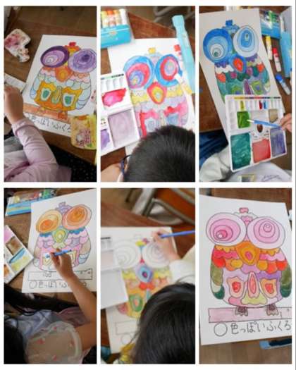 3年生は、図画工作科で水彩絵の具を使って「色っぽいフクロウ」を題材にして思い思いの彩色をしたフクロウが仕上がりました。