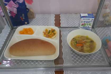 今日の給食の献立は、「黒糖パン、牛乳、豚肉と野菜のカレースープ煮、変わりピザ、みかん(缶)」でした。