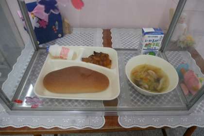 今日の給食の献立は、「黒糖パン、牛乳、じゃがいものミートグラタン、スープ、発酵乳」でした。