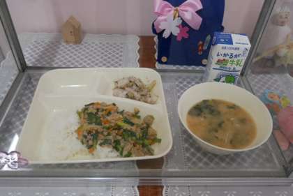 今日の給食の献立は、「ごはん、牛乳、豚ひき肉とにらのそぼろ丼、味噌汁、キャベツの赤じそ和え」でした。