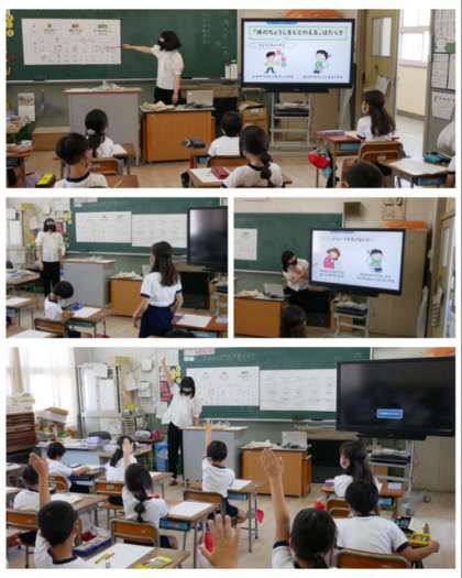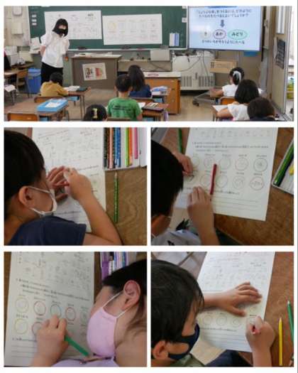 今日は、2年生が「じょうぶな体のつくり方」をテーマにして栄養指導を受けて、身近な食品が、それぞれ黄・赤・みどりのどの食べ物なのかを考えました。