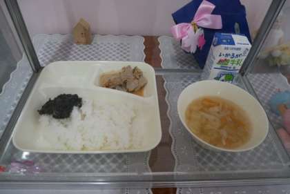 今日の給食の献立は、「ごはん、牛乳、豚肉の胡麻味噌焼き、すまし汁、海苔の佃煮)でした。海苔の佃煮は、給食調理員の手作りです。