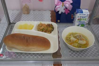 今日の給食の献立は、「黒糖パン、牛乳、カレードリア、豚肉とキャベツのスープ、りんご(カット缶)」でした。