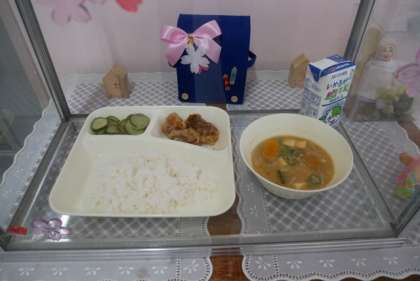 今日の給食の献立は、「ごはん、牛乳、豚肉の竜田揚げ、味噌汁、きゅうりの甘酢漬け」でした。